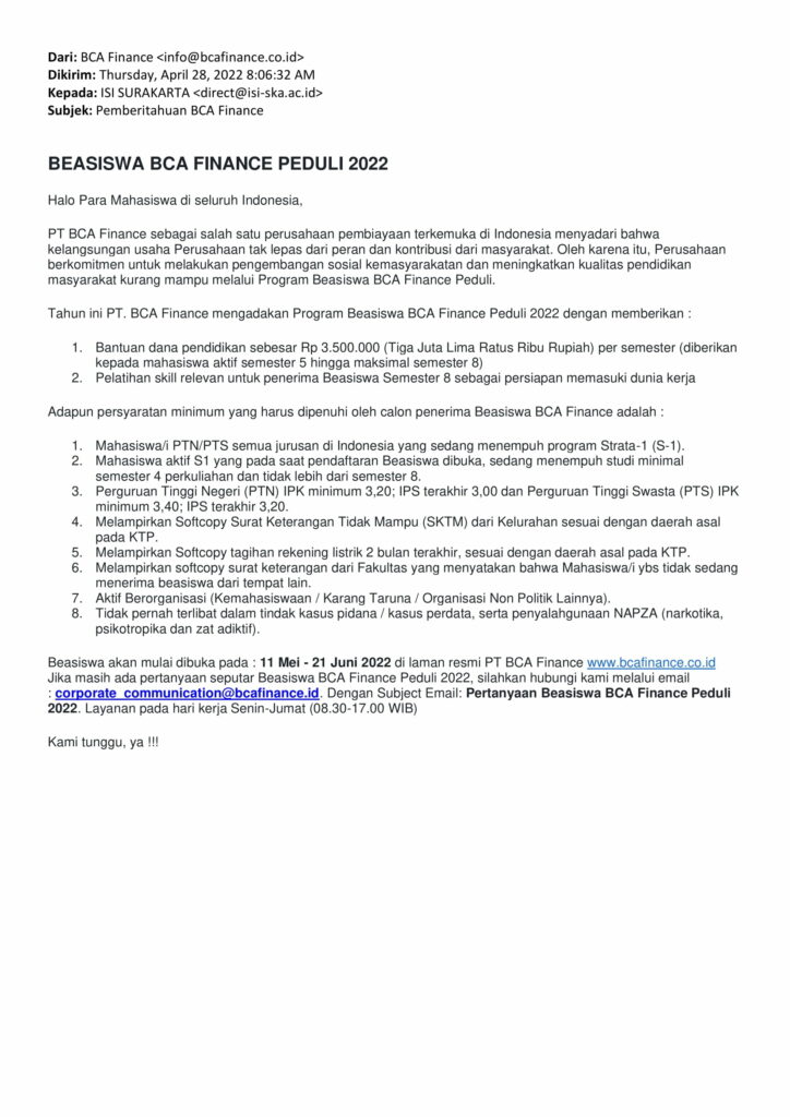 BEASISWA BANK CENTRAL ASIA (BCA) FINANCE PEDULI TAHUN 2022
