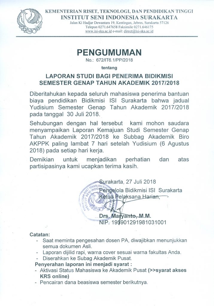 LAPORAN STUDI BAGI PENERIMA BIDIKMISI SEMESTER GENAP TH AKADEMIK 2017/2018