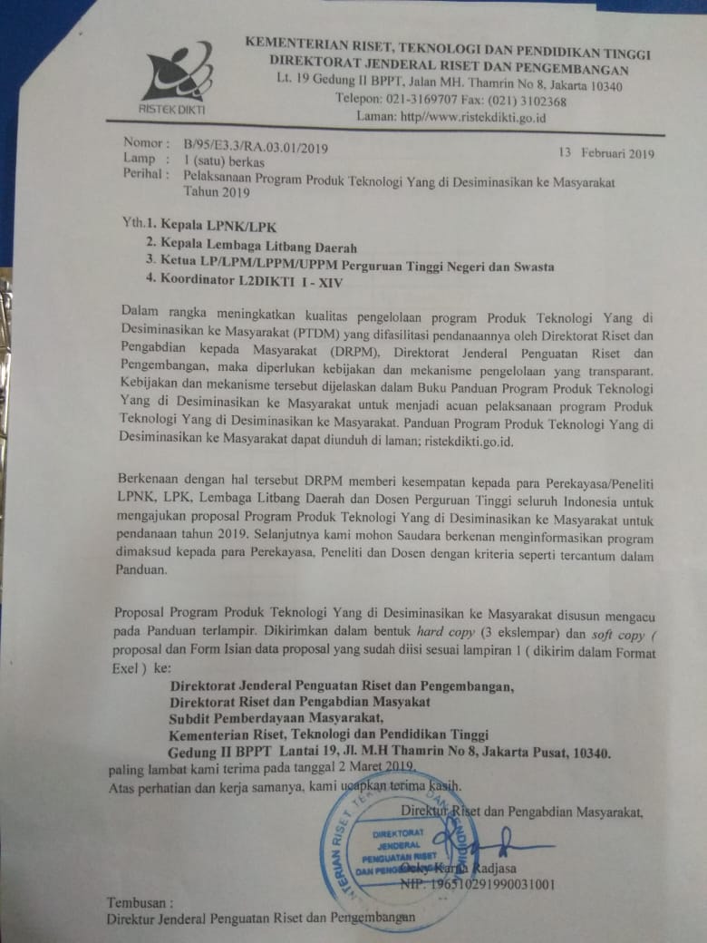 Pelaksanaan Program Produk Teknologi yang di Desiminasikan ke Masyarakat th 2019