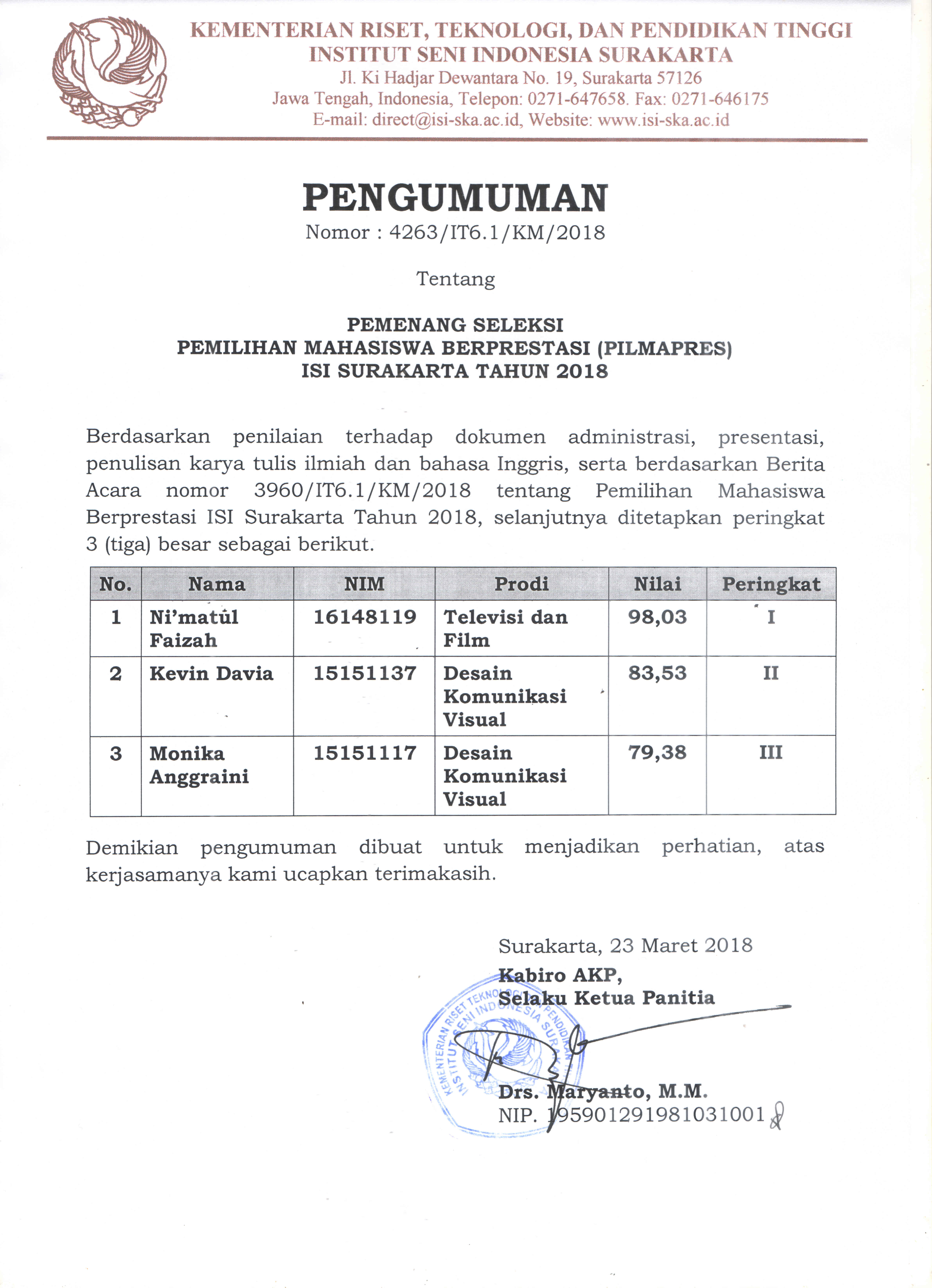 Pemenang Seleksi Pemilihan Mahasiswa Berprestasi (PILMAPRES) ISI Surakarta Tahun 2018