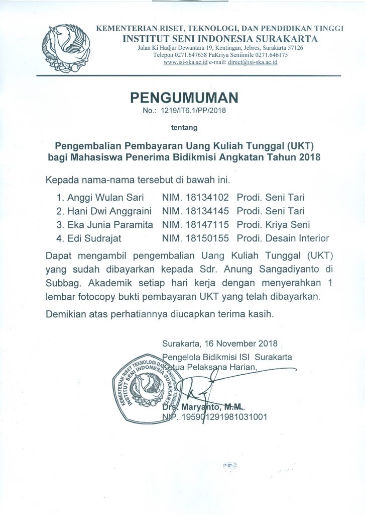 Pengembalian Pembayaran UKT Bagi Mahasiswa Penerima Bidikmisi Ang. Th 2018