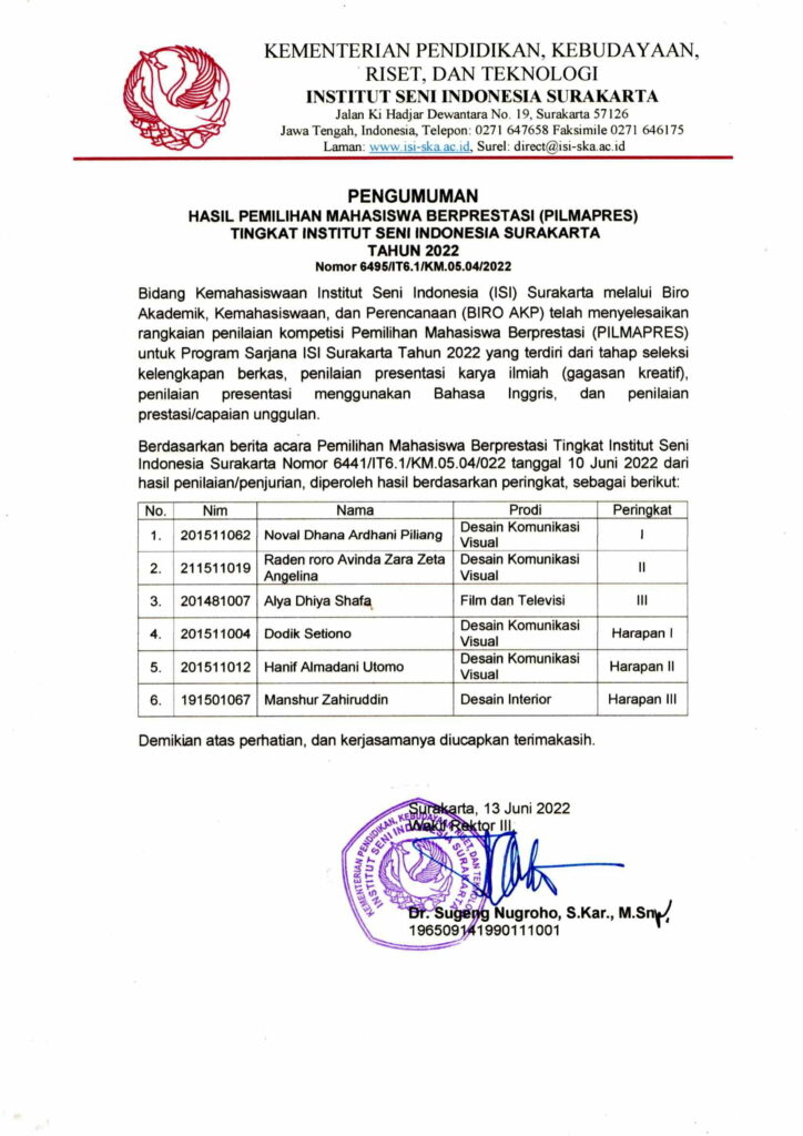 PENGUMUMAN : HASIL PEMILIHAN MAHASISWA BERPRESTASI (PILMAPRES) TINGKAT INSTITUT SENI INDONESIA SURAKARTA 2022