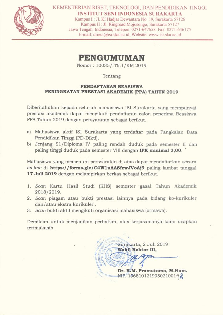 PENGUMUMAN : PENDAFTARAN BEASISWA PENINGKATAN PRESTASI AKADEMIK (PPA) TAHUN 2019