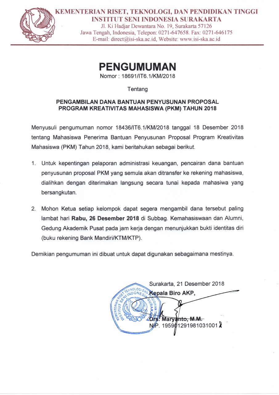 PENGUMUMAN : PENGAMBILAN DANA BANTUAN PENYUSUNAN PROPOSAL PROGRAM KREATIVITAS MAHASISWA (PKM) TAHUN 2018