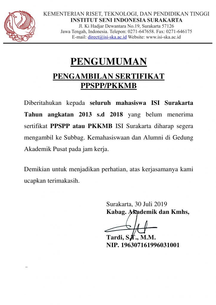 PENGUMUMAN : PENGAMBILAN SERTIFIKAT PPSPP/PKKMB