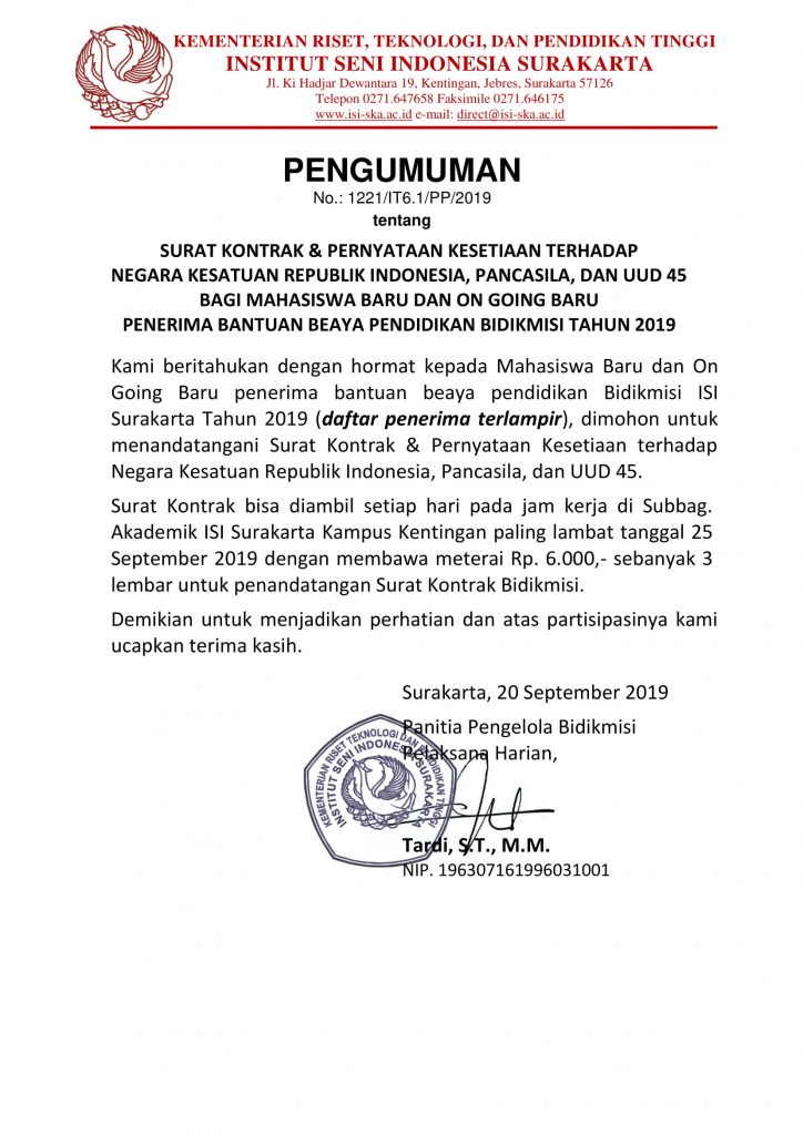 PENGUMUMAN : SURAT KONTRAK BAGI MAHASISWA BARU DAN ON-GOING PENERIMA BANTUAN BEAYA BIDIKMISI TAHUN 2019