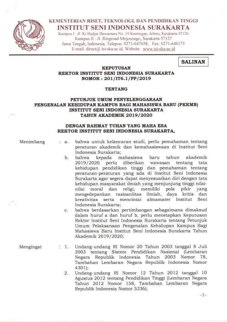 Surat Keputusan Rektor tentang Petunjuk Umum Penyelenggaraan Pengenalan Kehidupan Kampus bagi Mahasiswa Baru (PKKMB) Intitut Seni Indonesia Surakarta Tahun Akademik 2019/2020
